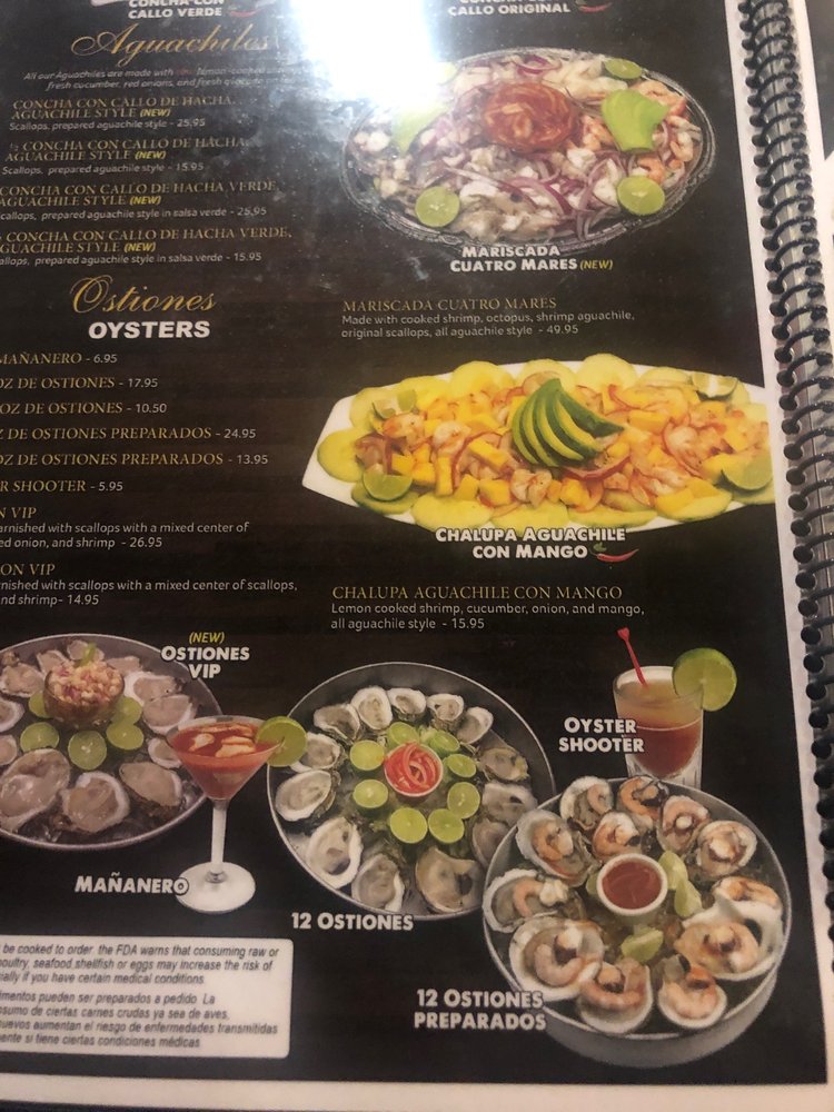 Fresh shrimp, aguachile, scallops, fish and shrimp ceviche and mango.
